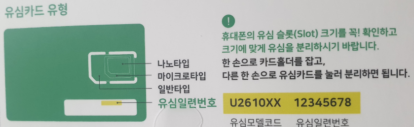 4. 사용하고 있는 핸드폰의 유심 타입을 확인하고 배송 온 유심카드를 크기에 맞게 분리합니다.