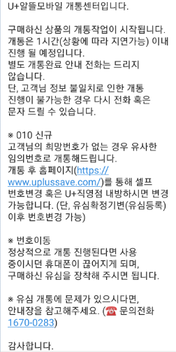 2. 개통 요청을 하면 개통하겠다는 문자와 카톡이 옵니다.