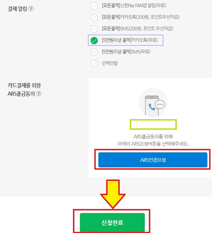 12. 결제정보 확인 후,ARS 인증 요청 및 완료 후 하단의 신청 완료를 누릅니다.