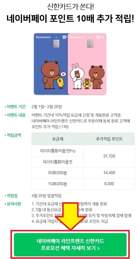 4. 10% 적립 요금제 페이지에 들어오면 아래로 내려가서 네이버페이 라인프렌즈 신한카드 프로모션 혜택 자세히 보기>를 클릭합니다.