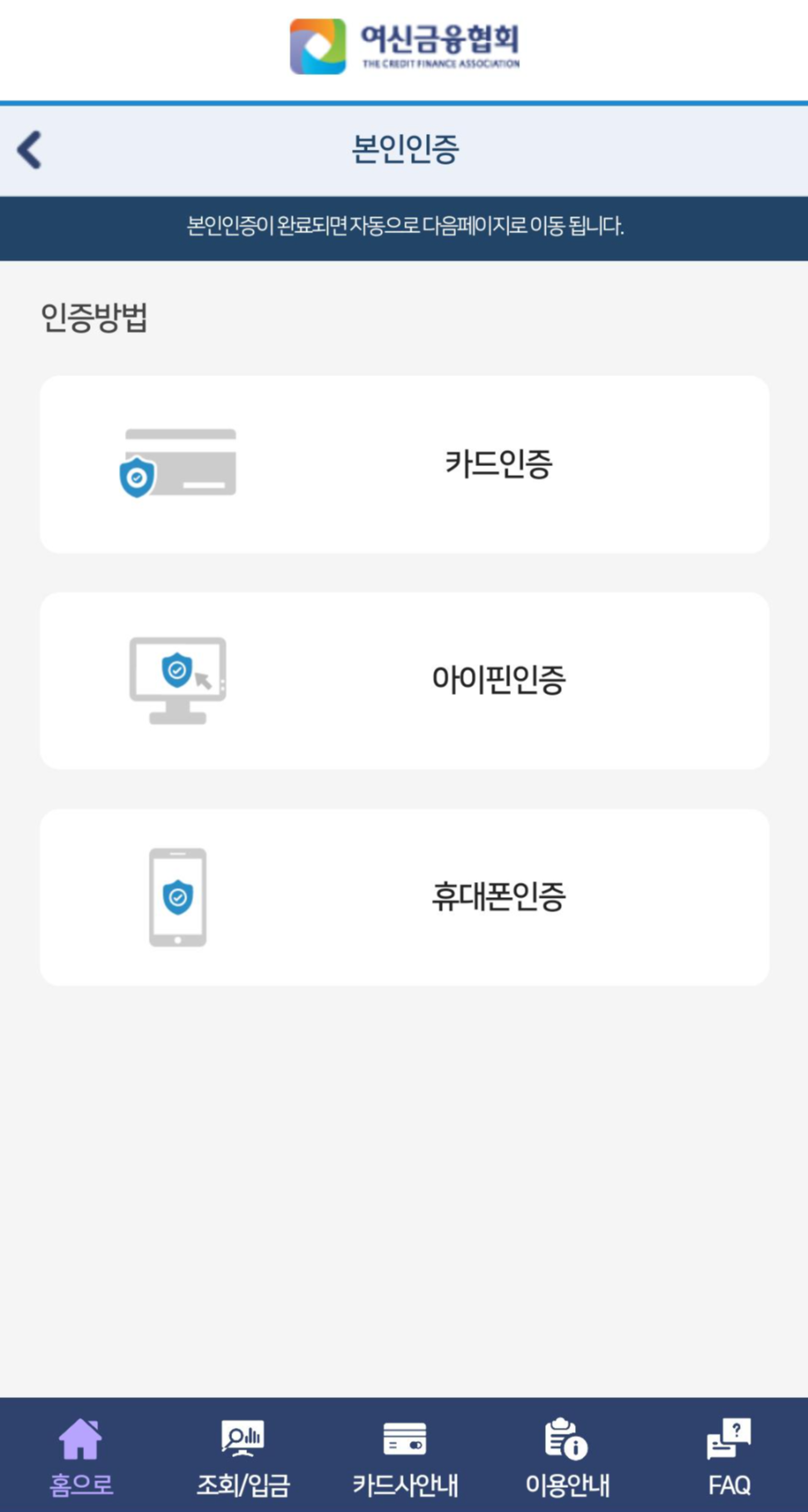 4. 카드 인증, 아이핀 인증, 휴대폰 인증 중 선택하여 본인인증