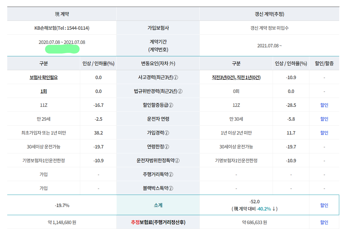 갱신보험료 할인, 할증 내역(등급, 사고유무, 법규위반 등),