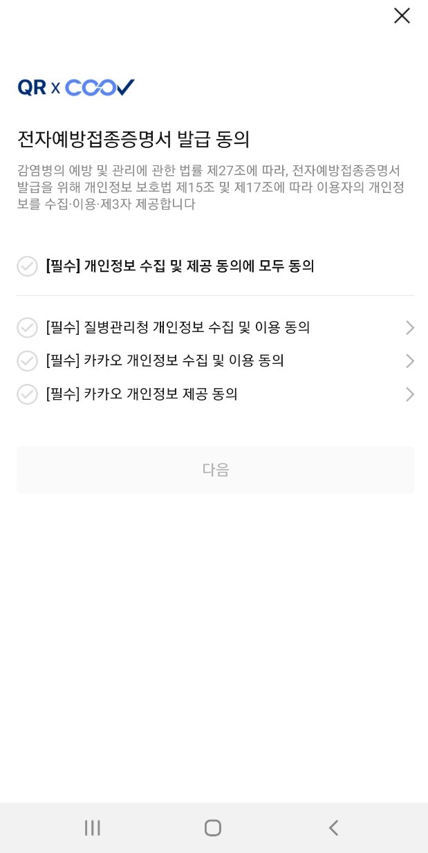 4. "QR x COOV 전자 예방 증명서 발급 동의" 화면이 나오는데 모두 동의를 체크하고 다음을 누릅니다.