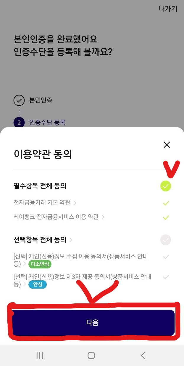 11. 이용약관 동의 화면이 나오면 "필수항목 전체 동의"를 하고 "다음"을 누릅니다.