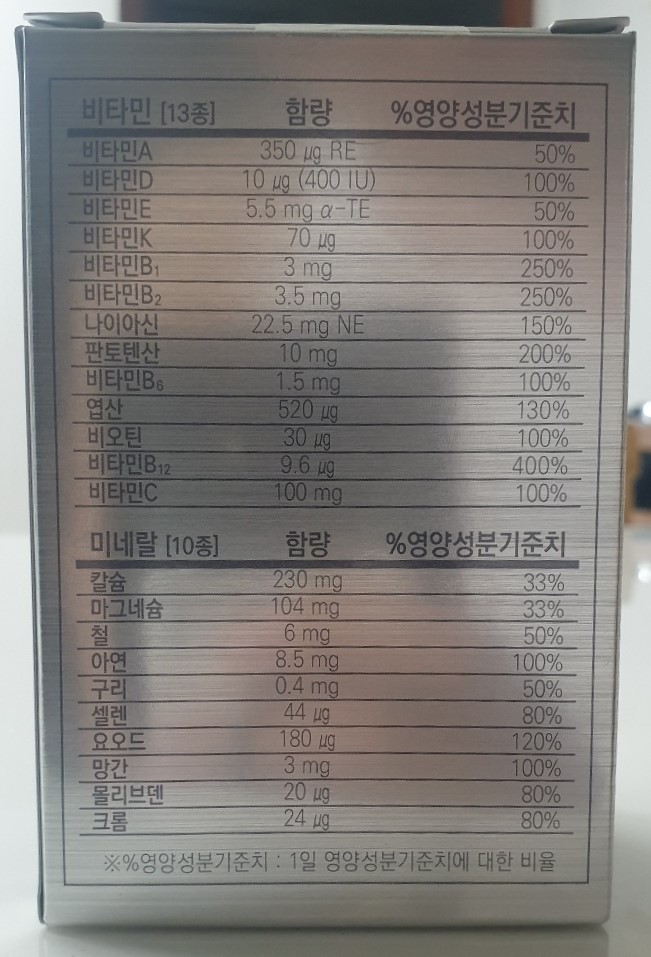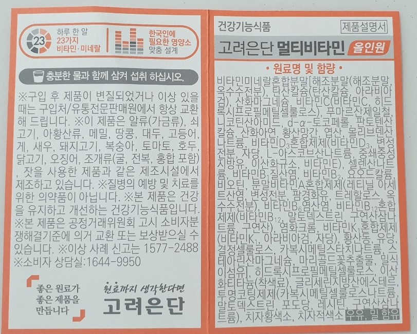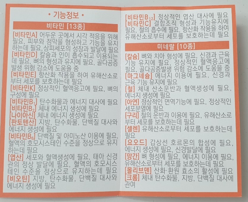 팜플릿 내용을 보니 고려은단 멀티비타민 올인원은 하루 한 알로 13가지 비타민과 10가지 미네랄을 챙길 수 있다고 합니다. 한국인의 식습관을 바탕으로 만든 비타민이라서 더 좋다고 하네요.